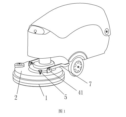洗地機(jī)刷盤牽引結(jié)構(gòu),包括刷盤電機(jī)及與刷盤電機(jī)底座固定連接的刷盤組件,刷盤電機(jī)及刷盤組件上套裝有刷盤罩,其特征在于:刷盤組件與刷盤罩之間設(shè)置有支架,所述支架穿過刷盤罩與洗地機(jī)提升桿鉸接連接;所述支架上還鉸接安裝有電機(jī)固定板,所述電機(jī)底座與電機(jī)固定板固定連接并固定在刷盤組件中心軸上,調(diào)節(jié)螺栓穿過支架及刷盤罩并頂緊在電機(jī)固定板的端面上。