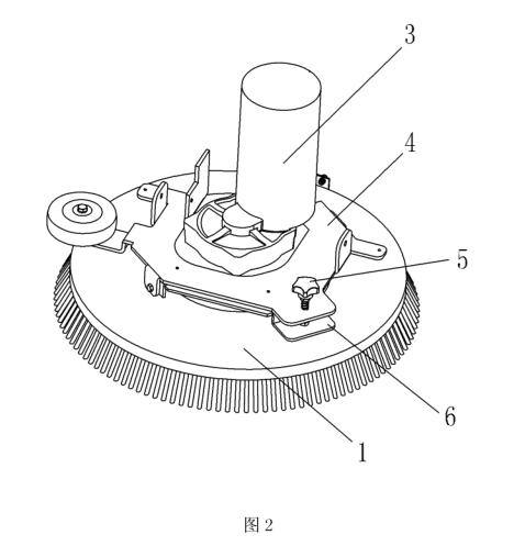 有益效果是:本實(shí)用新型在使用過程中,當(dāng)調(diào)節(jié)螺栓向下運(yùn)動(dòng)吋,電機(jī)固定板受カ繞鉸接軸轉(zhuǎn)動(dòng),產(chǎn)生偏擺,也帶動(dòng)刷盤組件向一側(cè)偏擺,從而増大了刷盤毛單側(cè)對(duì)地面的壓力,進(jìn)而在刷盤旋轉(zhuǎn)過程中形成了一定的牽引力,使刷盤轉(zhuǎn)動(dòng)更加輕松,減輕了操作者的疲勞強(qiáng)度;同時(shí),可根據(jù)地面條件的不同,對(duì)調(diào)節(jié)螺栓的旋入程度進(jìn)行調(diào)整,即調(diào)整對(duì)電機(jī)固定板的壓カ大小,從而改變刷盤毛單側(cè)對(duì)地面的壓力,以實(shí)現(xiàn)不同地面條件下牽引力大小的適度調(diào)整。